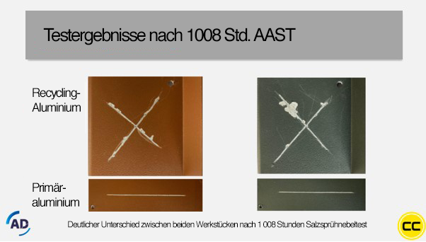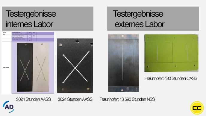 Außer durch Optimierung des Beizverfahrens kann den Marktentwicklungen auch auf andere Weise Rechnung getragen werden. So ermöglicht es PreCoat F31/20(D) von AD Chemicals, auch ohne Beizen eine ausgezeichnete Korrosionsschutzwirkung zu erzielen. Das auf führender Luft- und Raumfahrttechnologie basierende Produkt zeichnet sich durch die einzigartige Eigenschaft aus, dass in nur einem Verfahrensschritt eine vollständige chemische Vorbehandlung realisiert werden kann. PreCoat F31/20(D) ersetzt eine komplette Vorbehandlungsreihe durch einen einfachen Prozess ohne beheizte Tauchbäder und starke Chemikalien. Maßgebend dabei ist die Sauberkeit des Aluminium-Werkstücks. In manchen Fällen ist nur noch eine Entfettung notwendig, während das Beizmittel entfallen kann. Dies würde den CO2-Fußabdruck bei manchen Anwendern wesentlich verbessern. Die erzielten Testergebnisse (siehe Abbildung 5) sprechen für sich. Sogar die Anforderungen des CASS-Tests, einer anspruchsvollen Korrosionsprüfung aus der Automobilindustrie, werden erfüllt. Diese Technik wird inzwischen unter anderem in der Lkw-, Auflieger- und Landmaschinenindustrie in großem Umfang angewendet.