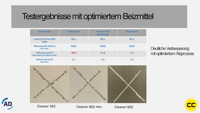 Die Ergebnisse dieses Tests (nach 1008 Stunden AAST) sind der Übersicht in Abbildung 3 zu entnehmen. Daraus geht hervor, dass mit Cleaner 502, dem regulären Beizmittel von AD Chemicals, die Norm knapp überschritten wird. Die erste Optimierungsmaßnahme (Cleaner 602 min.) bringt bereits eine klare Verbesserung, und mit dem vollständig optimierten Produkt (Cleaner 602) wird ein perfektes Ergebnis erzielt.